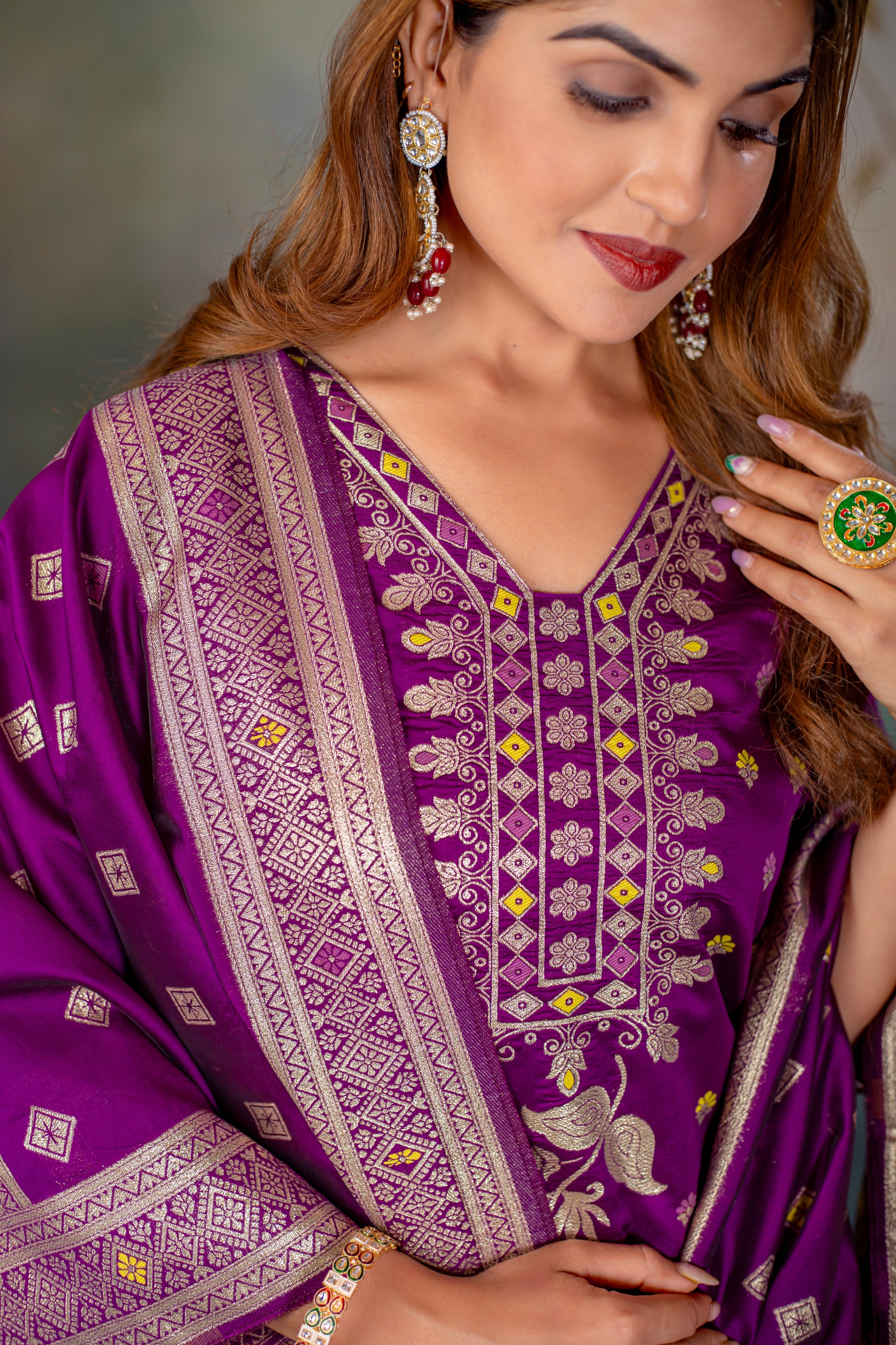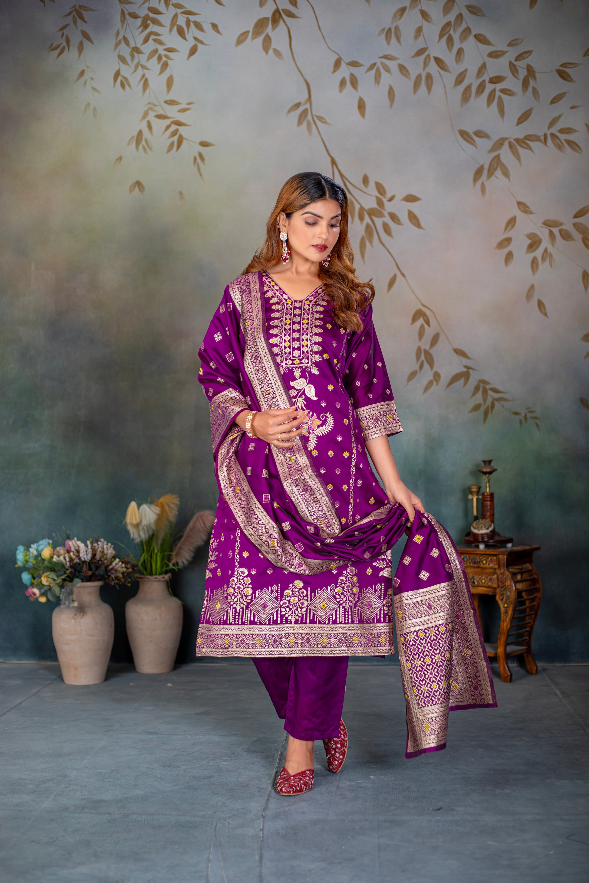 Elevate your ethnic wardrobe with this stunning teal blue silk kurta set. Crafted with intricate Jacquard and traditional motifs, this outfit features a straight-fit kurta with detailed neckline work, paired with matching bottoms and a beautifully woven dupatta. Perfect for festive occasions, weddings, and family gatherings, this elegant set combines rich fabric with timeless design. Style it with statement jewelry and heels for a graceful look.